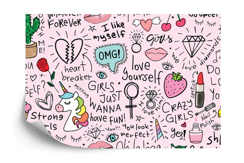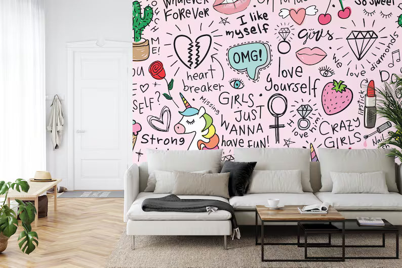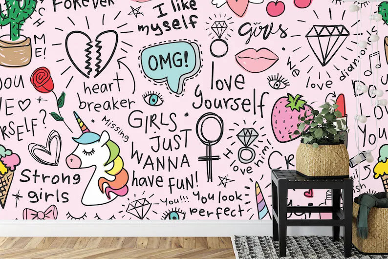 Pink Doodle Girls Room Wallpaper Mural, Unicorn Art Print, Peel and Stick
