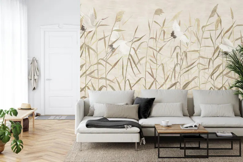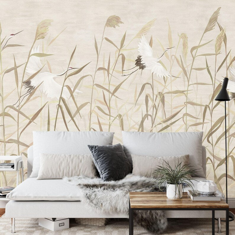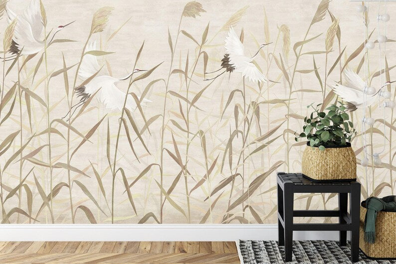 Reeds and Storks Wallpaper Mural, Hand-Drawn Art Print, Peel and Stick Decal