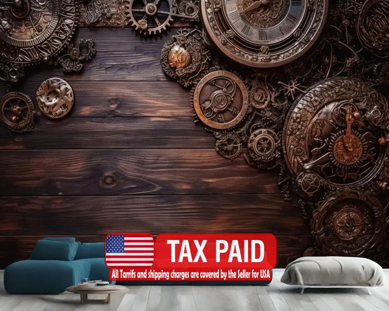 Steampunk Gear Wood Wallpaper Mural, Peel and Stick Removable Wall Art