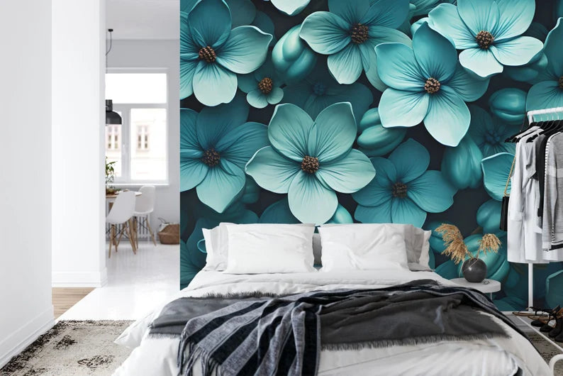Teal Floral Wallpaper Mural | Blooming Flower Wall Decal, Peel & Stick