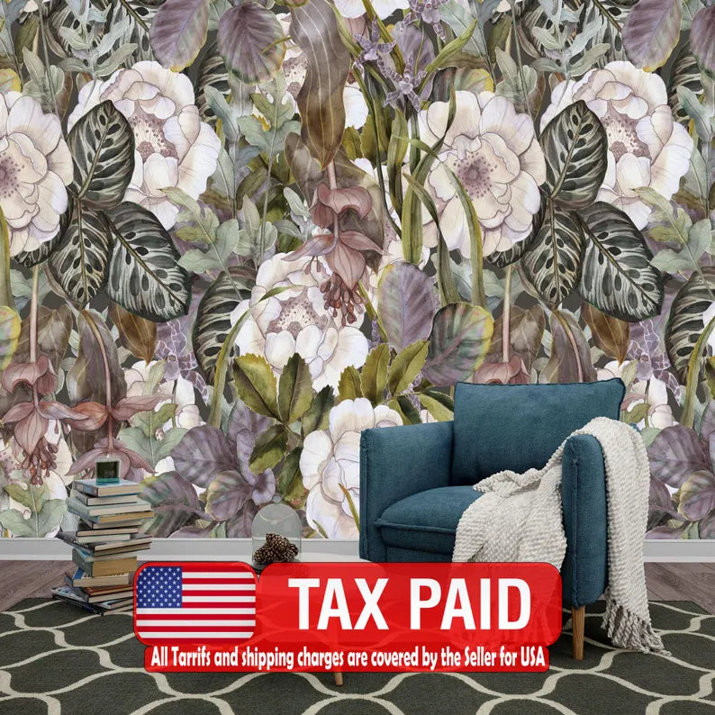 Tropical Flowers Wallpaper Mural, Watercolor Floral Decor, Peel and Stick