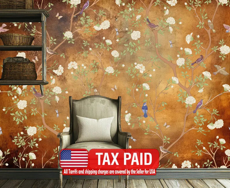 Vintage Chinoiserie Floral Bird Wallpaper Mural - Peel and Stick Wall Decal