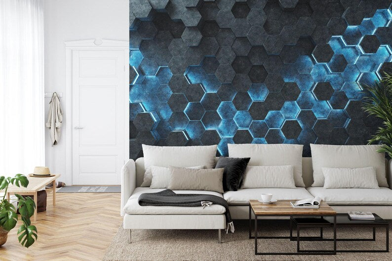 Wallpaper, Black Blue Hexagon 3D Wall Mural, Gaming Room Decor, Peel and Stick