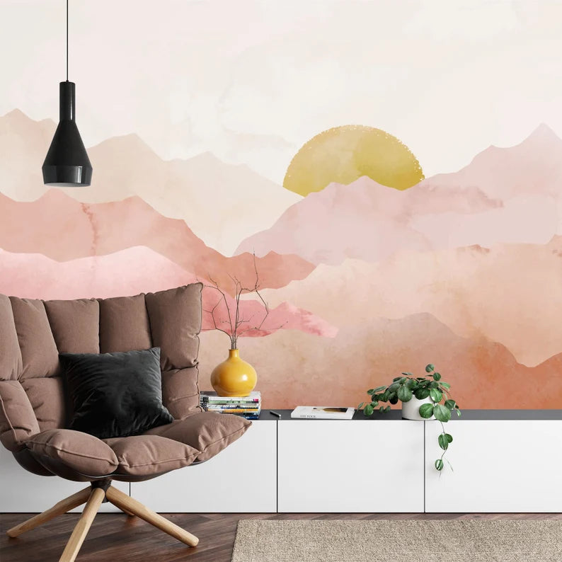 Watercolor Sunset Mountain Wallpaper, Pastel Nursery Wall Mural, Self-Adhesive