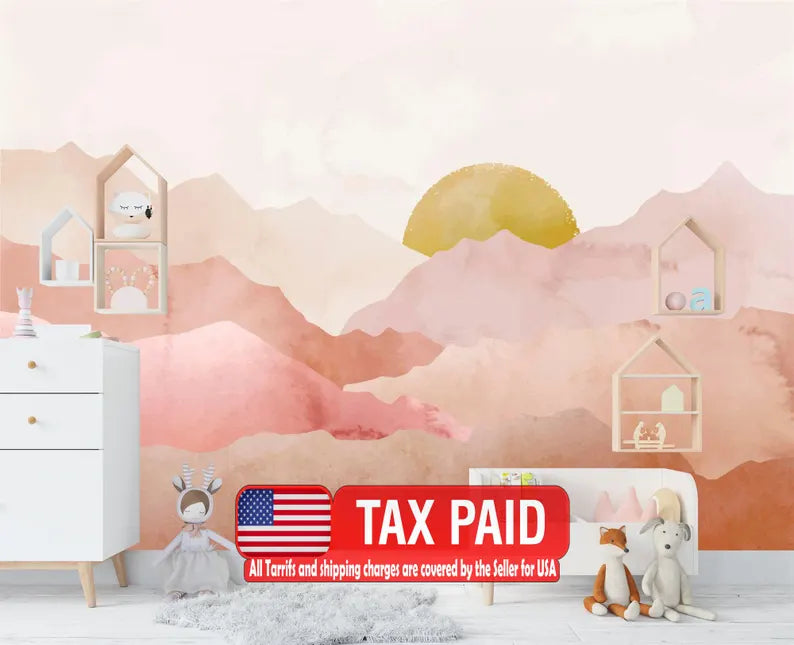 Watercolor Sunset Mountain Wallpaper, Pastel Nursery Wall Mural