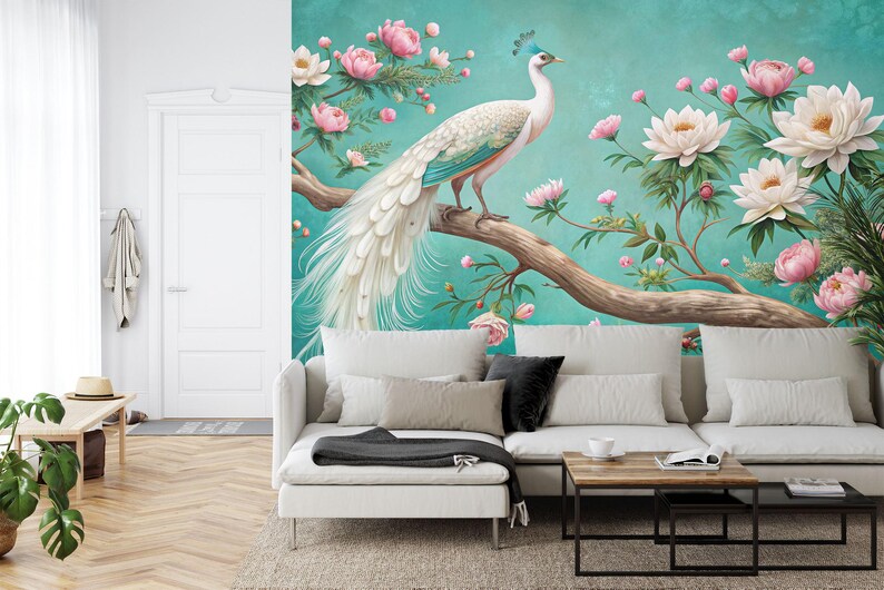 White Peacock Floral Garden Mural, Peel and Stick Wallpaper